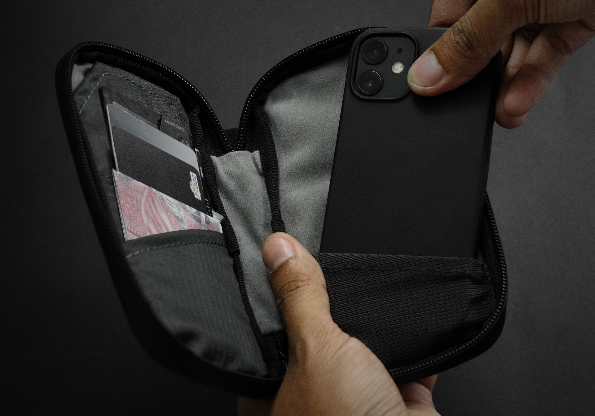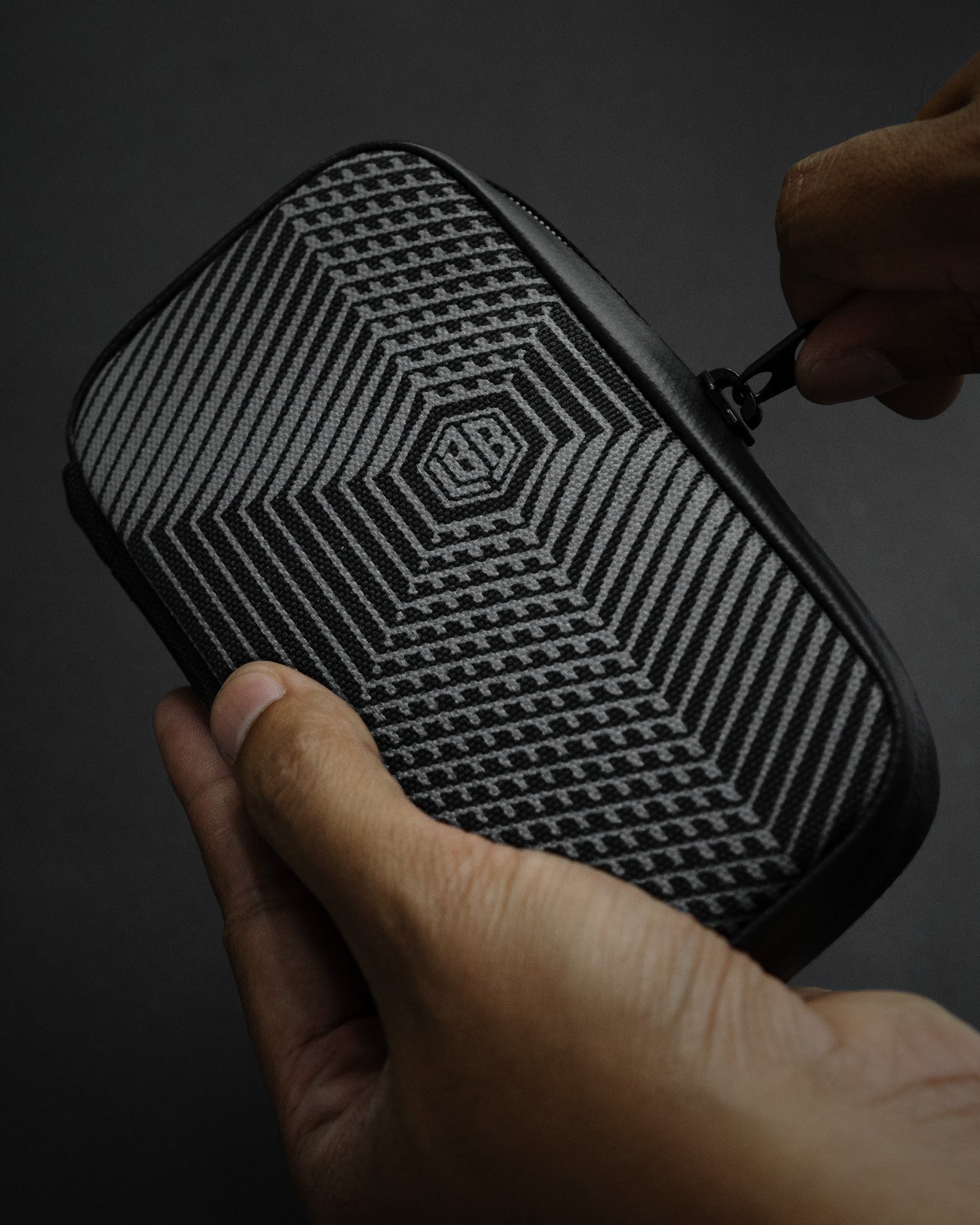 A multi-purpose pouch with weatherproof 600D Polyester in Sonar pattern for the main body and Aquaguard® water repellent zipper, keeping all your essentials together and snugly sat in your jersey pockets. Features soft touch felt inner lining to protect delicate phone screens and internal dividers for cards and coins. Fits up to 6,1” phones such as iPhone 14 Pro and Galaxy S23, or even a complete set of spare tire kit including tube patch, inner tube, and mini multi-tool.