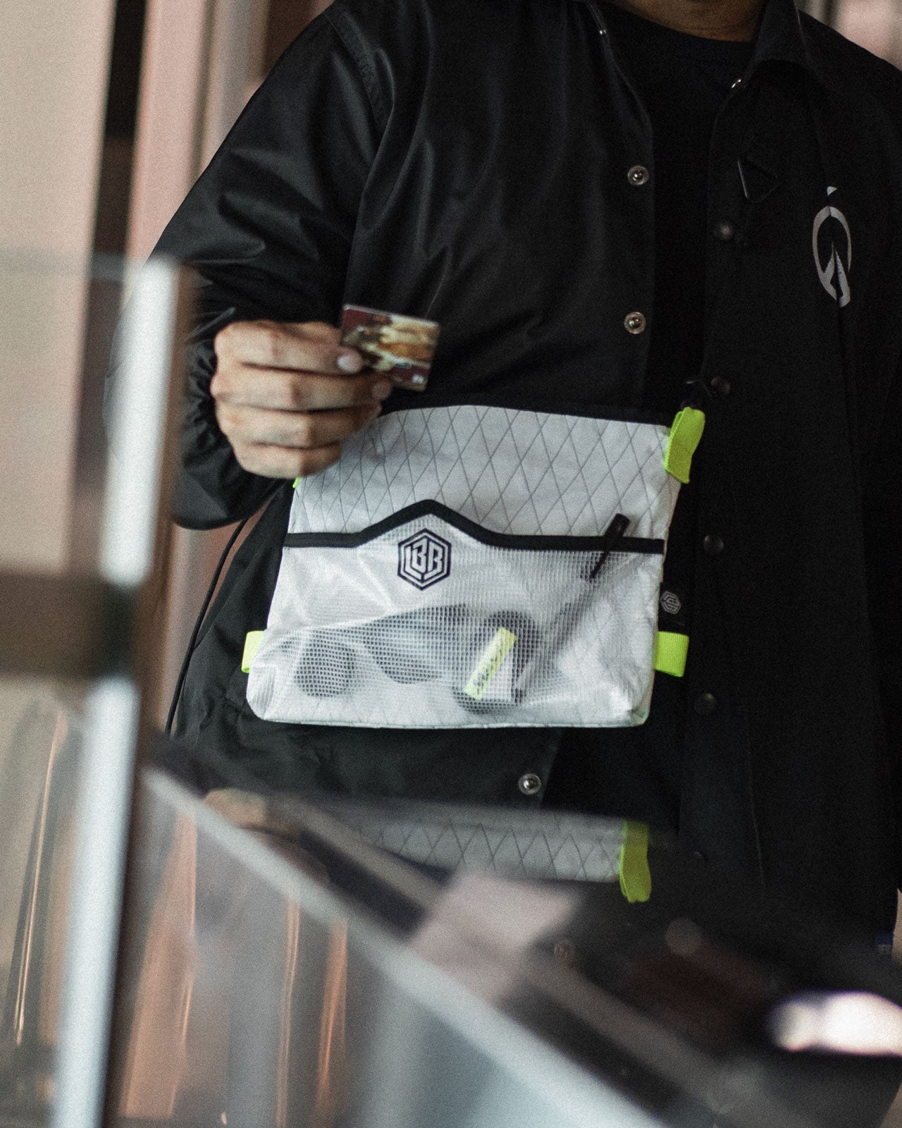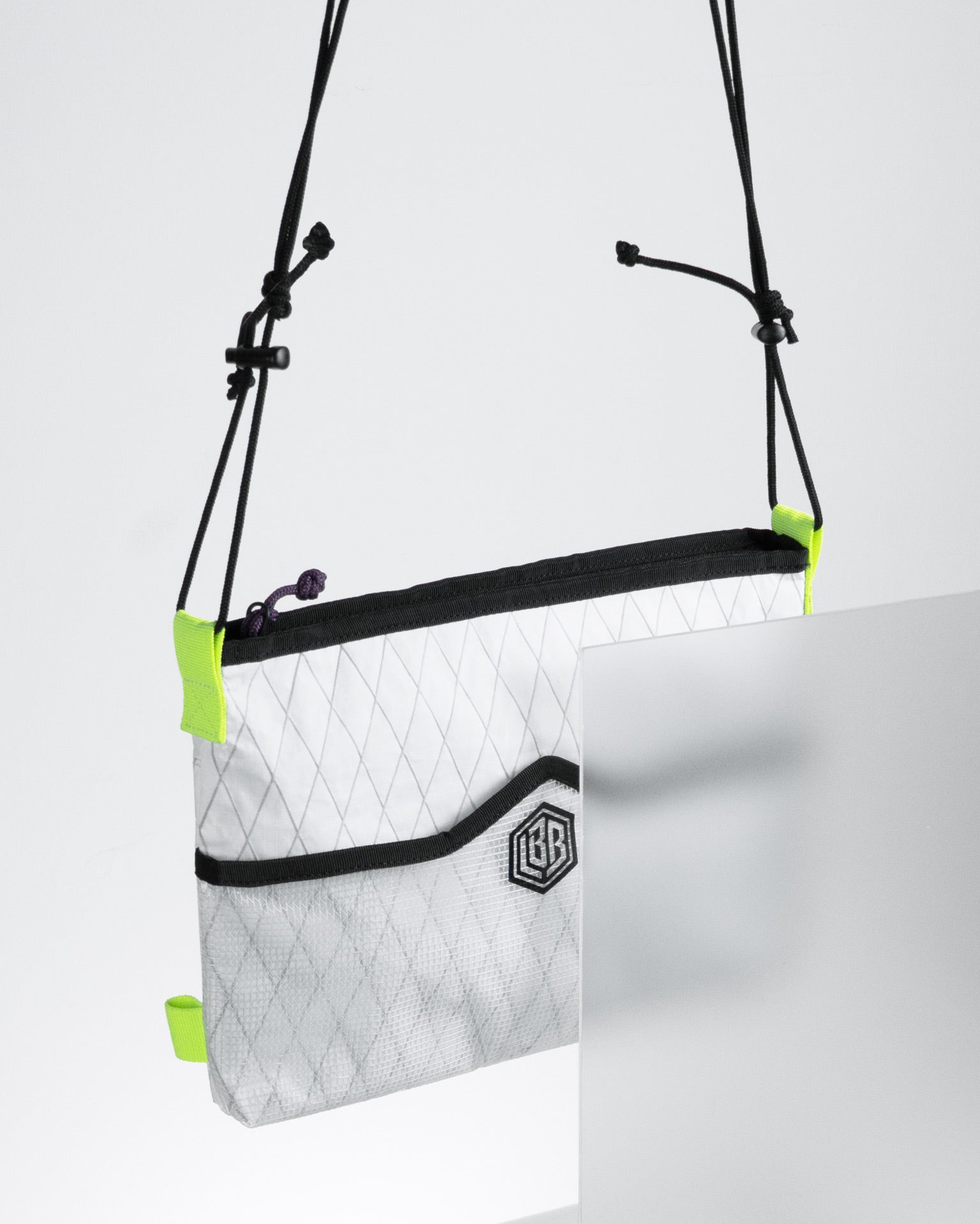 The Arctic/Cyberlime version of The Sacoche, uses VX07 white ripstop fabric by X-Pac®. Which comprises three laminated layers: an inner layer of lightweight polyester film that minimizes stretch and offers waterproofing, a mid-layer of recycled X-Ply® fibers that enhances stability and tear resistance, and an outer layer of 70D ripstop nylon with a Durable Water Repellent (DWR) coating. The Sacoche Arctic/Cyberlime is 22% lighter than the regular version.
