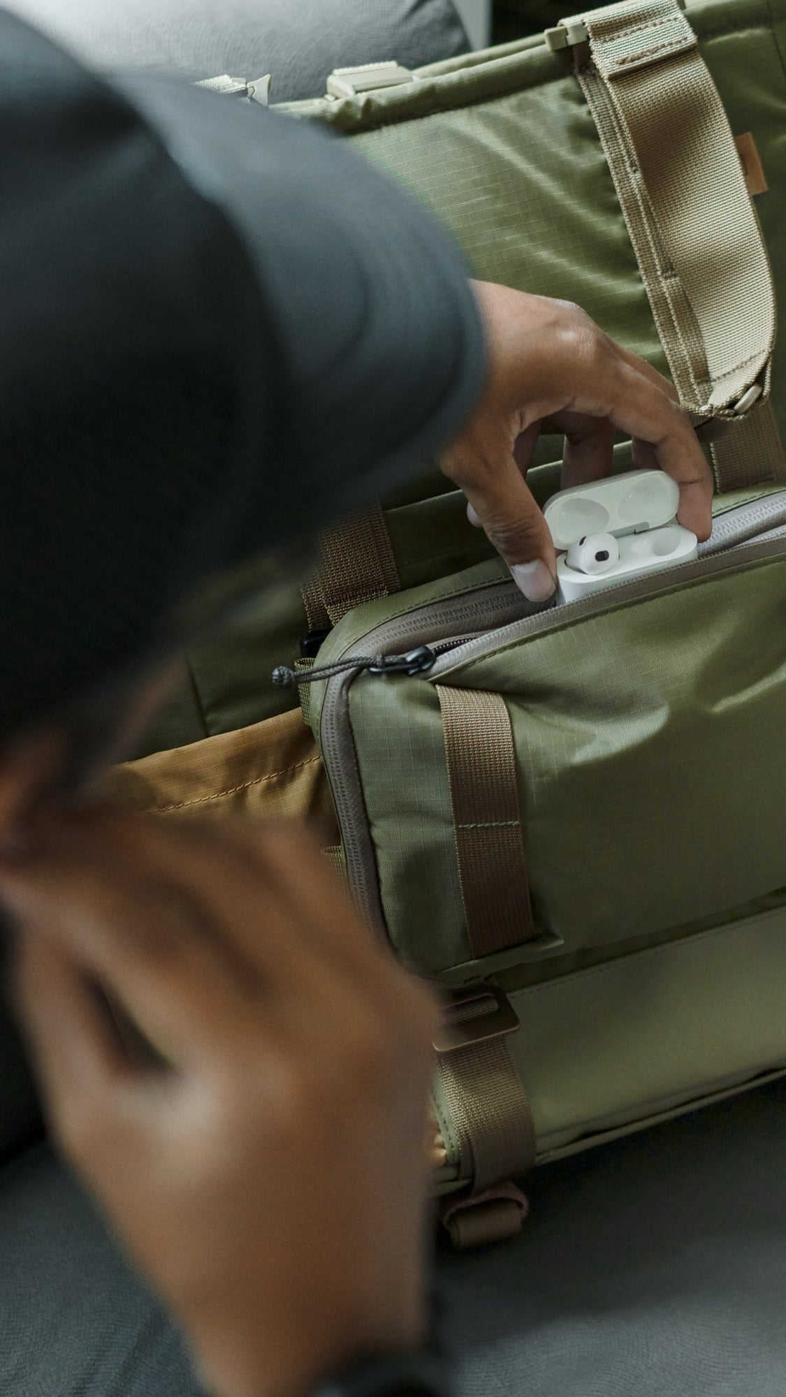 210D nylon ripstop (DWR) • Transparent ripstop pocket • Nylon webbing • Webbing loops • Padded constructions • YKK Aquaguard® zipper • Elastic pockets • Elastic webbing slots