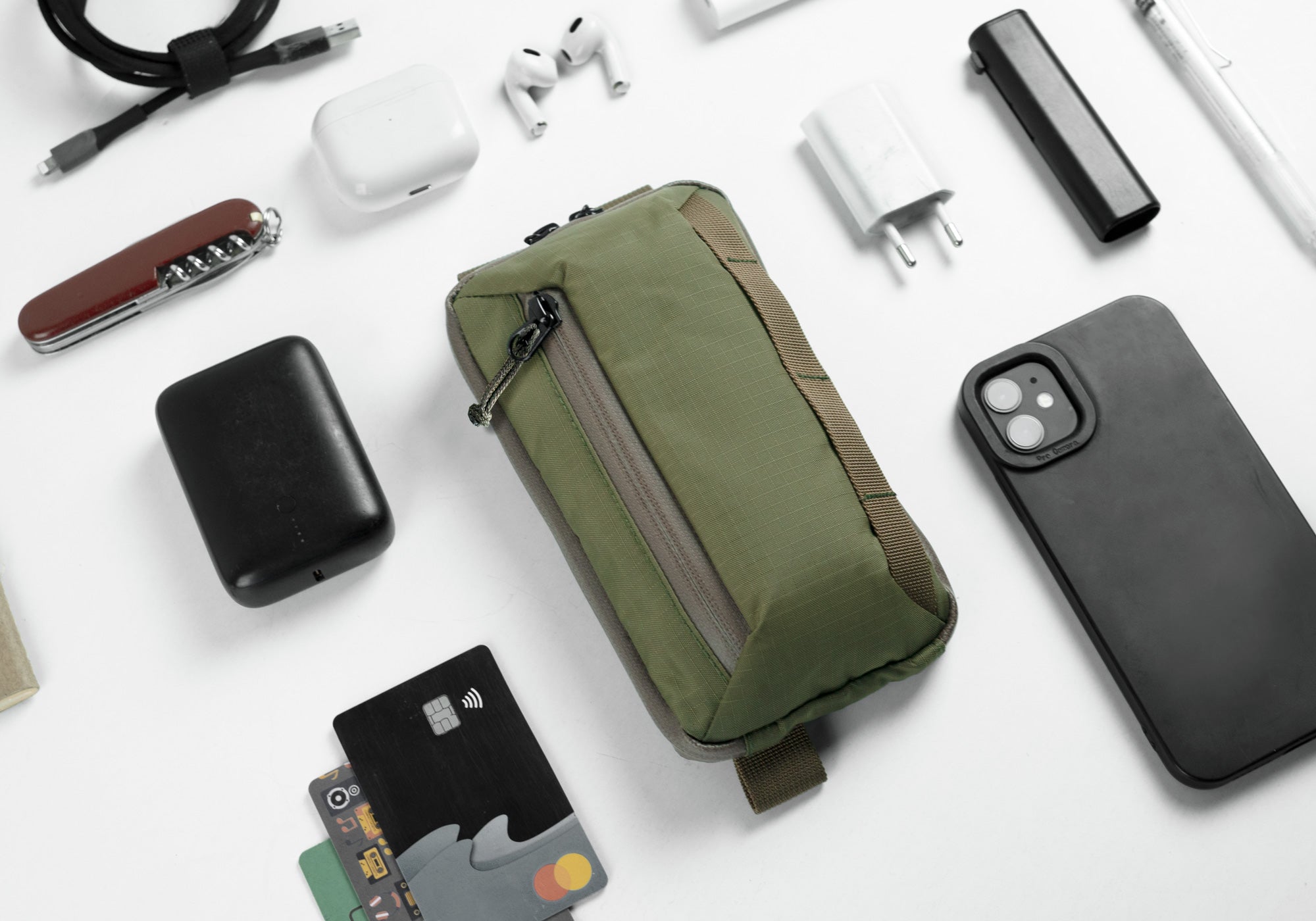The Division - Quarter Pouch is a compact organizational pouch designed for everyday essentials. Larger than our phone pouches like The Tiny Houdini, it offers enhanced functionality with three elastic card-sized pockets, each capable of holding multiple cards, along with a convenient catch-all pocket accessible from both inside and outside, perfect for small items like earbuds and multitools. Additionally, it features a full-length compartment perfectly sized for phones up to 6.5". Versatile and adaptable, the Quarter Pouch is ideal for a phone-and-wallet combo or any EDC items you desire. Carry it on its own, attach it to the shoulder strap of most of our backpacks, or use it with the optional sling strap, the latter being the perfect setup for carrying pocket cameras. This pouch seamlessly integrates with the Transition Tote and is modular, allowing stacking with up to four Quarter Pouches or pairing with other Division lineup pouches like the Half Pouch or Dex Mini Pouch for expanded organizational possibilities.