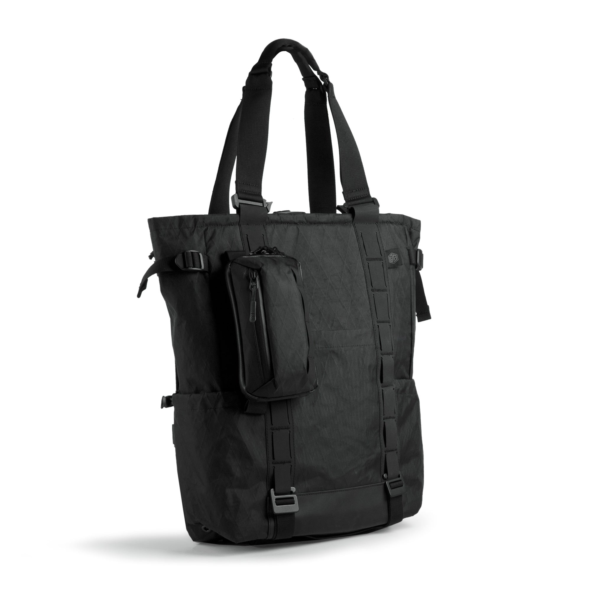 X21 Black X-Pac™ fabric • DWR 210D nylon ripstop inner liner • Transparent ripstop pocket • Nylon webbing • Hypalon loops • Padded constructions • YKK Aquaguard® zipper • Elastic organizer pockets • Soft-felt phone slot