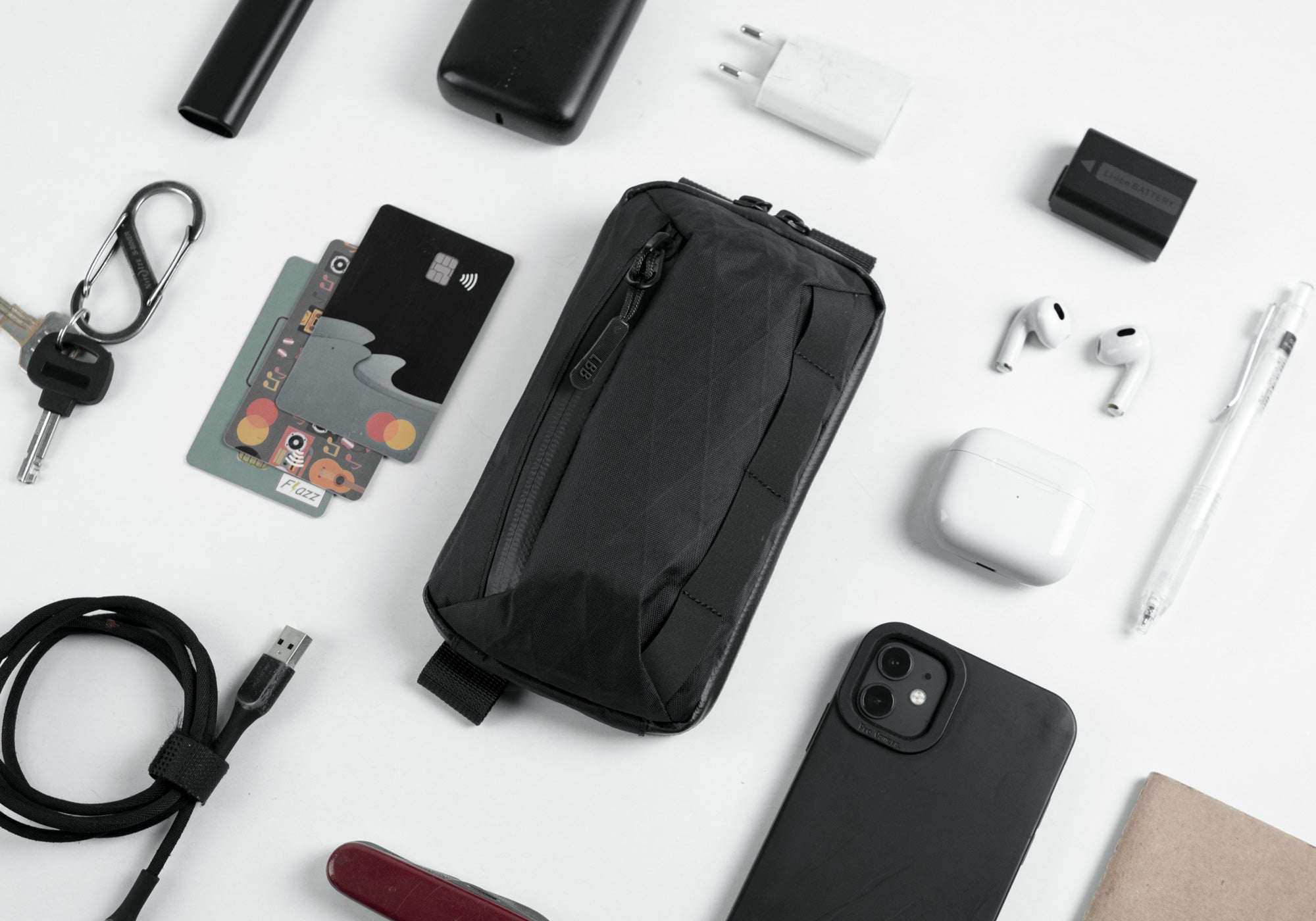 The Division - Quarter Pouch is a compact organizational pouch designed for everyday essentials. Larger than our phone pouches like The Tiny Houdini, it offers enhanced functionality with three elastic card-sized pockets, each capable of holding multiple cards, along with a convenient catch-all pocket accessible from both inside and outside, perfect for small items like earbuds and multitools. Additionally, it features a full-length compartment perfectly sized for phones up to 6.5". Versatile and adaptable, the Quarter Pouch is ideal for a phone-and-wallet combo or any EDC items you desire. Carry it on its own, attach it to the shoulder strap of most of our backpacks, or use it with the optional sling strap, the latter being the perfect setup for carrying pocket cameras. This pouch seamlessly integrates with the Transition Tote and is modular, allowing stacking with up to four Quarter Pouches or pairing with other Division lineup pouches like the Half Pouch or Dex Mini Pouch for expanded organizational possibilities.